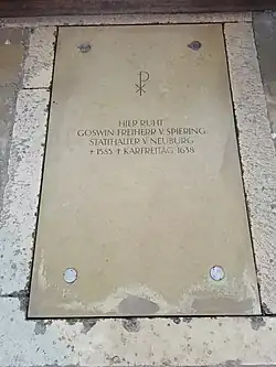 - Leonhard Mayr: ... Catholische Leich Sermon, bey ... Leich und Begroebnus, dess... Herrn Goesswins Freyherrens von Spyringk auff Risswick ... gewesten Fürstl. Pfaltz ... gehaimen Raths Praesidenter, der Fürstenthumbs Neuburg ... gehalten ... den 6. Apr. ... 1638, Neuburg 1638