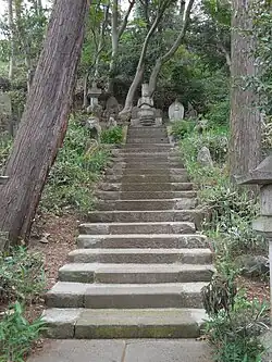 Hinter dem Museum erstreckt sich ein Garten, der bis zum Fuß der Anhöhe reicht und kleine Teiche enthält. Oben befinden sich zwei Teehäuser (Kokei-rō und Fujimi-tei), zahlreiche Steinfiguren und zahlreiche Steinlaternen sowie ein kleiner Schrein. Auf dem terrassenförmig gestalteten Hang steht, als städtisches Naturdenkmal eingetragen, die „Kobushi-Magnolie von Kaminoge“. Ein Stein neben dem alten Tempeltor im Garten trägt die Inschrift „不許葷酒入山門“, d. h. „Keine Erlaubnis: mit Knoblauch oder Alkohol durchs Tempeltor“. Im Hintergrund sieht man einen Nyorai-Buddha inmitten eines Altar-Ensembles auf halber Höhe. Der Garten enthält auch eine größere Sammlung von Steinlaternen.