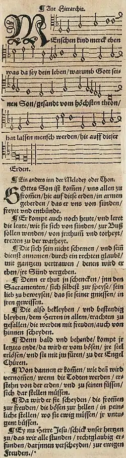 Die Melodie stammt von dem spätmittelalterlichen lateinischen Marienlied Ave hierarchia[12] aus der Abtei Hohenfurth in Südböhmen (1410). Von Michael Weiße wurde sie 1531 in die erste Ausgabe des Gesangbuchs der Böhmischen Brüder zu dem Lied Menschenkind, merk eben übernommen.[2]