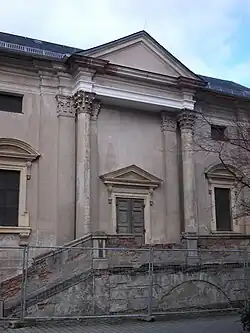 Der Haupteingang zum kirchlichen Friedhof ist ein neugotisches Bauensemble. Im Zentrum der dreiteiligen Anlage befindet sich die Kapelle, eine Basilika ohne Querschiff. Der eingezogene Chor im Westen schließt sich polygonal an. Die drei Gebäude sind durch Arkadengänge miteinander verbunden.[2]