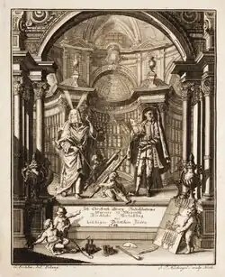 - Schauplatz hoher Ritter-Orden Nebentitel zeitweilig Almanach auf das Jahr nach der gnadenreichen Geburt unsers Herrn und Heylands Jesu Christi ( = Théatre des plus célèbres Ordres de Chevalerie), gezeichnet von Gottfried Eichler und dann gestochen von Jacob A. Friderich, Augspurg: Friderich, 1755 (nachgewiesen bis 1957);[2]