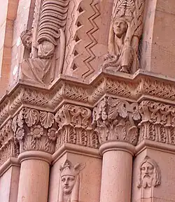 - die Symbole der vier Evangelisten an der Fensterrosette, Tier- und Kleinfiguren, sowie Ornamentschmuck am 1853 neu errichteten Westwerk des Speyerer Domes, darunter die Trägerfigur eines Speyerer Brezelverkäufers,[3]