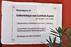 - ↑ Ehrentafel für den Sozialdemokraten und Ehrenbürger Gottlob Kamm angebracht. In: Schorndorfer Nachrichten vom 22. Oktober 2007, hier auf der Webpräsenz der SPD Schorndorf. Abgerufen am 6. Juli 2012.
