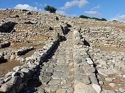 Die Ringstraße biegt nun nach Westen ab und führt hinauf zum Hügelplateau und erreicht zunächst einen Platz. Südwestlich des Platzes befindet sich eines der wenigen Gebäude (Haus He) aus der mykenischen Zeit. Für dieses Haus wurden größere und besser behauene Steine verwendet. Nördlich des Platzes befindet sich eine dreistufige Treppe, ähnlich den Schautreppen der minoischen Paläste, jedoch geht die von Gournia um die Ecke. Links neben der Treppe befindet sich eine runde Steinplatte, der sogenannte Kernos, der kultischen Zwecken diente. Man vermutet, dass der Platz sowohl als Agora, für kulturelle und soziale Veranstaltungen, wobei die Treppe als Sitzplatz dienen konnte, als auch bei Kulthandlungen verwendet wurde.