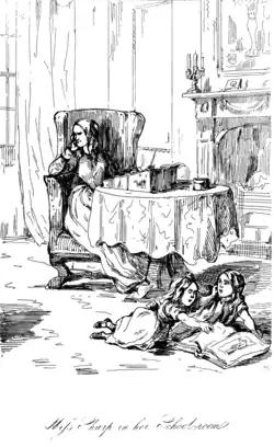 Elisabeth Bernhardi nannte 1798 als mögliche Erwerbstätigkeit für Frauen höherer Stände neben einer Gouvernantentätigkeit nur noch Wirtschafterin, Krankenpflegerin in Privathaushalten und Handarbeitslehrerin. Von diesen Alternativen war der Gouvernantenberuf der qualifizierteste und der mit dem höchsten Sozialprestige.[41] Die Option, ohne (größeren) Verlust des sozialen Status als Krankenpflegerin zu arbeiten, stand außerdem nur deutschen Frauen offen. Bei den Pflegekräften, die in der ersten Hälfte des 19. Jahrhunderts in britischen Krankenhäusern arbeiteten, handelte es sich in der Regel um ehemalige Dienstboten, die keine anderweitige Anstellung fanden und daher gezwungen waren, sich ihr Brot durch diese Arbeit zu verdienen. Nicht besser war das Ansehen der Krankenpflegerinnen, die Kranke in deren Heim pflegten. Charles Dickens karikierte in seinem 1842 bis 1843 erschienenen Roman Martin Chuzzlewit in der Figur der Sairey Gamp eine solche Krankenpflegerin als inkompetent, nachlässig, alkoholabhängig und korrupt.[42] Die von Florence Nightingale ab 1860 initiierten Reformen bei der Krankenpflegeausbildung hatten auch zum Ziel, diesen Beruf als gesellschaftlich anerkannten Ausbildungsweg für Frauen der Mittelschicht zu öffnen.