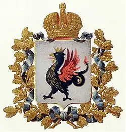 Wappenbeschreibung: In Silber ein goldgekrönter, goldbewehrter, rotgeflügelter schwarzer Basilisk (Zilant) mit roter Schwanzspitze (Wappen Kasans). Auf den Schild ruht die goldene Landeskrone des Königreiches Kasan. Der Schild ist von zwei goldenen Eichenzweigen umrankt und mit hellblauen Band gebunden.