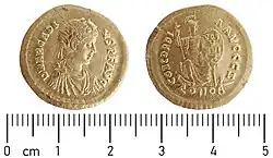 - ↑ Radio Westfalica / audio media service Produktionsg mbH & Co KG: Goldmünze aus dem vierten Jahrhundert in Porta Westfalica gefunden. 4. November 2021, abgerufen am 3. August 2023.
