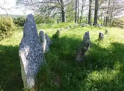 Das Steinschiff liegt auf einem Bergrücken und besteht aus 22 Menhiren, die in südöstlicher Richtung ein Schiff von 17,5 m Länge und einer Breite von 5,0 m bilden. Im Zusammenhang mit dem Steinschiff steht ein Gräberfeld mit 24 sichtbaren Gräbern, einem Steinkreis (deutsch „Richrerring“) und drei ovalen Steinkreisen. In den Bereichen zwischen dem Steinkreis und dem Steinschiff fanden sich einige Perlen und eine Speerspitze, die wahrscheinlich zu einem durch die Landwirtschaft zerstörten Grab gehörten.
