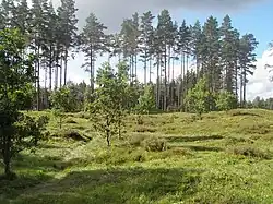 Das Gräberfeld umfasst 45 vorzeitliche Monumente, darunter niedrige Rundhügel mit bis zu 20 Meter Durchmesser, Langhügel von 10 Meter Länge, einen Steinkreis, eine über 10 Meter lange, beschädigte Schiffssetzung (erhalten sind die Stevensteine und vier weitere Steine) und eine Steinreihe.