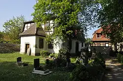 Auf dem Friedhof entstand 1771 eine zweite, schlichte Gottesackerkirche, ihre Wetterfahne mit der Jahreszahl 1588 erinnerte an den ehemaligen Marktturm. Der Friedhof selbst enthielt eine Reihe alter Gräber, neben dem Grabmal des Pestpfarrers fand sich die Grabstelle des ersten evangelischen Pfarrers Promist († 1574), die Grabstätten derer von Bachoff mit ihren Wappen aus dem 17. und 18. Jahrhundert, ein Obelisk der Magdalena Eger, geborene Ostückenberg († 1798) und weitere, aufwändig gestaltete Grabstellen.[8] Neben einigen verwitterten Resten historischer Grabsteine beherbergt der Friedhof heute nur noch verhältnismäßig neue Grabstätten ab dem Ende des 19. Jahrhunderts.