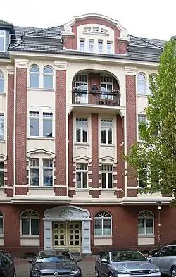 Das Gebäude ist als barockisierender Klinkerbau ausgeführt. Es bildet mit den Nachbarhäusern eine geschlossene Bebauung und hat über dem Erdgeschoss ein zu Haus 14 durchgehendes Gurtgesims. In den Obergeschossen laufen zwei Erker risalitartig unter einem Mansardwalmdach zusammen, mittig gekrönt durch ein Zwerchhaus. Die Loggia im 3. OG ist mit Korbbögen geschlossen. Die unverputzten Mauerstreifen in den Obergeschossen sind als Kolossalpilaster ausgearbeitet, die Fassadenflächen dazwischen zum Teil verputzt. Ein in verschiedenen Ausführungen wiederkehrendes Dekormotiv ist eine Bekrönung mit geknickten Konturen, die in Voluten auslaufen.