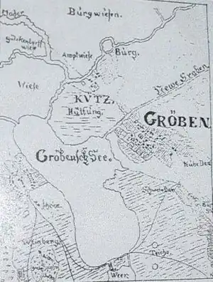 Die Karte zeigt nördlich vom Gröbener Kietz den von der Alten Nuthe umschlossenen Burgwall. Westlich der Burgwiesen fließt die Nieplitz, die zu dieser Zeit Moder genannt wurde. Die Flussläufe weichen erheblich von den Lagen zu Beginn des dritten Jahrtausends ab. Der Begriff Hütung unterhalb vom Kietz bezeichnet in etwa eine Weide mit Bewachung. Unverändert zum Jahr 2004 ist die Lage des zentralen Kirchplatzes in Gröben. Am Weer südlich des Gröbener Sees schließt sich der damals wie heute kurze Wasserdurchgang zum Siethener See an; durch diese Enge zwischen den beiden Seen verläuft heute die Verbindungsstraße zwischen Gröben und Großbeuthen mit den Abzweigungen nach Siethen und Jütchendorf. In der Südwestecke ist der noch vorhandene und auch so bezeichnete Jütchendorfer Weinberg mit einer Dreiteilung eingezeichnet, die das Anbaugebiet zu je einem Drittel Gröben, Siethen und Jütchendorf zuweist.