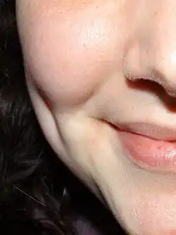 Die meisten Menschen besitzen Grübchen an ihrem Körper, die entweder ständig oder nur bei Anspannung bestimmter Muskeln zu sehen sind. Letztere entstehen wahrscheinlich durch winzige Muskelfasern oder bindegewebige Verwachsungen mit Muskeln, welche die Haut nach innen ziehen. Im Wangenbereich bilden sich bei vielen Menschen kleinere, meist annähernd symmetrisch, sehr selten nur einseitig ausgebildete Einziehungen, wenn sich beim Lachen, Grinsen oder Lächeln bestimmte Gesichtsmuskeln verkürzen. Hauptverantwortlich dafür ist der zur Lachmuskulatur gehörende Musculus risorius. Hat dieser Muskel an einer Stelle eine besonders feste Verbindung zur Haut der Wangen, so zieht er sie bei Anspannung nach innen und lässt dadurch die Wangengrübchen entstehen.[9]