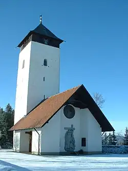 - Der Buchheimer Hans, auch Langer Hans genannt, am südlichen Ortsrand, ist der Kirchturm der ehemaligen Chorturmkirche, die ursprünglich dem Heiligen Johannes dem Täufer geweiht war. Der Turm datiert ins 14. Jahrhundert.[10] Anfang Juni 1677 wurde der Turm mit Pfarrkirche und den umliegenden Gebäuden von durchziehenden sächsischen Truppen angezündet.[7] 1742 wurde die Pfarrkirche wieder aufgebaut.[6] Nach dem Bau der barocken Kirche im heutigen Ortskern wurde das Langhaus der Chorturmkirche abgebrochen. Im Jahr 1980 wurde der rund 27 Meter[11] hohe Turm restauriert und ist seitdem als Aussichtsturm begehbar.[12] 109 Treppenstufen führen vom Eingang 24 Meter in die Höhe bis zu den Fenstern.[13] Von hier bietet sich ein herrlicher Ausblick in die nähere Umgebung vor allem in Richtung Osten und Süden, bei klarem Wetter über den Linzgau, den Hegau und über die gesamte Alpenkette von der Zugspitze im Osten bis in die Berner Alpen. Er wurde von der Denkmalstiftung Baden-Württemberg zum „Denkmal des Monats Oktober 2010“ ernannt.[7] Unterhalb des Turmes befindet sich heute der Friedhof sowie eine Soldaten-Gedächtnisstätte.