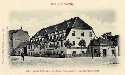 1825 bewarb sich der Wirt der Grünen Schenke um die Konzession der Gastgerechtigkeit, das heißt die Beherbergung von Gästen mit zugehöriger Pferdeausspanne. 1830 wurde in der Grünen Schenke der erste landsmannschaftliche studentische Kommers abgehalten und 1882 der Turnverein für Anger und Crottendorf gegründet. Ab 1860 hatte eine aus Leipzig kommende Pferdeomnibuslinie ihre Endstelle an der Grünen Schenke in Anger.[1]
