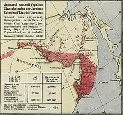 Nach den Untersuchungen des sowjetischen Wissenschaftlers Wladimir Maximowitsch Kabusan[6] wanderten zwischen 1883 und 1905 insgesamt 172.876 Menschen in den Fernen Osten ein, 109.510 Menschen oder 63,4 % aller Auswanderer kamen aus ukrainischen Provinzen. Die meisten von ihnen ließen sich in der Region Primorje nieder – 77.139 Ukrainer oder 78,1 %. Unter den Einwanderern in die Region Amur war in diesem Zeitraum der Anteil der Ukrainer geringer und betrug 47,8 %. Es sollte hinzugefügt werden, dass nach Herkunftsort unter den Siedlern im Amur-Gebiet die Bevölkerung von Poltawa mit 64,51 % die Mehrheit darstellte, es gab deutlich weniger Menschen aus der rechtsufrigen Ukraine. Kabusan behauptet, dass der Anteil der Ukrainer in der Region Primorje vor 1903 nie weniger als 75 % betrug. Laut der Volkszählung von 1897 war die ukrainische Sprache (gelbe Farbe auf der Karte rechts) die häufigste Sprache im Bezirk Süd-Ussuri.