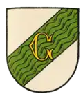 Blasonierung: „Geteilt und unten gespalten; oben in Silber ein grüner Schräglinksbalken in Form eines Bachs, belegt mit dem goldenen Großbuchstaben G, unten vorne in Gold ein rotgezungter, schwarzer Stierrumpf, hinten in Rot schräg übereinander drei silberne Lindenblätter.“[12] |