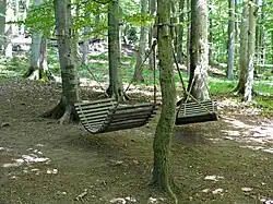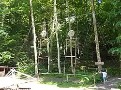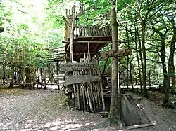 Der Weg führt weiter zu einem Abenteuerspielplatz mit einer Holzkegelbahn, Holzwippen, übergroßen Hampelmännern („Waldmänner“, die auch an der Landesgartenschau Gießen 2014 zu sehen waren), einem lebensgroßen Brettwürfelspiel, einer Heuhüpfburg und einem großen begehbaren Holzwidder.[16] Vom Spielplatz führt ein Weg zum „Robin-Hood-Dorf“ mit Baumhäusern, Kletterseilen, einem Holz-Tipi und zu einem Labyrinth.