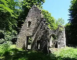 Entlang des Rundwegs liegt die denkmalgeschützte mittelalterliche Kirchenruine St. Valentin. Der rudimentär erhaltene Bau der um 1260 errichteten gotischen Pfarrkirche zeigt einen quadratischen Chorturm mit spitzbogigem Triumphbogen und ein rechteckiges Schiff mit Überresten eines Fensters mit Maßwerk an der Westseite. Die Kirche ist der letzte Hinweis auf die Wüstung Ruthardshausen und wurde 1970 wieder hergerichtet.[17] Eine Glocke der Kirche befindet sich heute in der evangelischen Kirche im Nachbardorf Einartshausen. An der Seitenwand der Kirche wurde 2008 ein Beinhaus entdeckt.[18] Bei den Ausgrabungen wurden Teile der Kirchhofmauer rekonstruiert. In der Kirchenruine finden Gottesdienste und kulturelle Veranstaltungen statt.