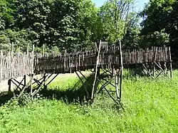 Auf der nördlichen Schleife zurück zum Ausgangspunkt des Rundwegs liegen archäologische Stationen mit nachgestellten Grabungsstellen. Eine historisch nachempfundene Köhlerei gibt Einblicke in die Siedlungsgeschichte der Region.[21] Die Köhlerei gehörte bis ins 19. Jahrhundert zu den wichtigsten Erwerbsquellen der ansässigen Bevölkerung.[22] (Nahe der Wüstung Ruthardshausen wurden ehemalige Glashütten entdeckt.[23]) Von einem drei Meter hohen Holzsteg (Beobachtungsstation „Alte Eiche“) auf Pfählen, der in eine Lichtung entlang des Höllerskopfbachs ragt, lassen sich Rotwild und Auerochsen in einem Wildgehege beobachten. Vom Gehege geht der Rundweg vorbei am Robin-Hood-Dorf zurück zum Anfang. Eine Wegebahn („Wald-Taxi“) fährt über die Südschleife des Rundweges zum Aussichtsturm und zurück.