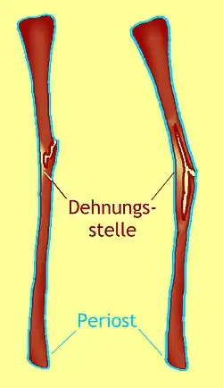 Ein Teil des Knochens kann dabei der Krafteinwirkung durch elastische Verformung nachgeben, während ein anderer Teil (meistens der knick-außenliegende, siehe Abb.) aufgrund der größeren Dehnungsbelastung bricht, wobei sich der Knochen im Bereich zwischen gedehntem und gebrochenem Teil längs spalten kann.