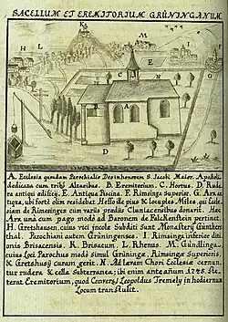 Das Dorf wurde Ende des 14. Jahrhunderts weitgehend durch einen Ritter von Schnewlin zerstört.[1] Die Grüninger Pfarrkirche St. Jakobus, die 1273 erstmals urkundlich erwähnt worden war, wurde wiederaufgebaut. Das St.-Jakobus-Patrozinium ist das älteste nachweisbare im Breisgau. Jahrhundertelang war die Kirche Pilgerstation am Jakobsweg nach Santiago gewesen.[2]