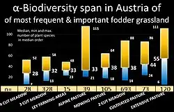 Im österreichischen alpinen Zentralraum schwankt die Biodiversität (Alpha-Diversität) von Grünland zwischen 7 und 114 Arten und liegt im Mittel bei 35 Pflanzenarten auf 100 m² nach einer Zusammenstellung von Humer (2015).[6][7]