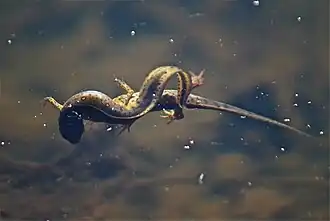 Beim Schlüpfen sind die Larven etwa 7–9 mm lang.[11] Sie ernähren sich hauptsächlich von kleinen Wirbellosen wie Flohkrebsen, Zuckmückenlarven und Wasserflöhen.[12] Im Verlauf von zwei bis fünf Monaten entwickeln die aquatischen Larven zunächst die Vorderbeine und schließlich auch die hinteren Gliedmaßen. Ab einer Länge von 3,5–3,8 cm erfolgt die Metamorphose zum landlebenden Eft.[8]