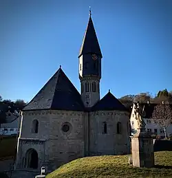 - Im Stadtteil Grünsfeldhausen steht eine der wenigen noch erhaltenen romanischen Oktogonkirchen in Süddeutschland, die um 1220 erbaute Kapelle St. Achatius. Seit der Erbauung hat sich die Talsohle um ca. 3 m in mehreren Stufen erhöht. Von 1903 bis 1905 wurde der ursprüngliche Eingang wieder freigelegt.