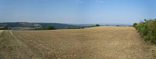 | Blick von Burg Neuleiningen auf das Eckbachtal nebst Eckbachweiher am Nordrand des Pfälzerwaldes und das Windrad an der Bitternell, dem Südwestgipfel des Grünstadter Bergs; darunter die A 6 und Neuleiningen; links im Hintergrund der Kleine Donnersberg (bis 328,6 m) mit dem Weiler Nackterhof | ||