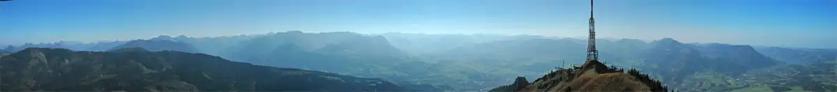 Vom Gipfel des Grünten hat man eine umfassende Aussicht auf die Allgäuer Landschaft. Darüber hinaus reicht der Blick bei guten Sichtbedingungen in die Schweiz im Westen, zur Zugspitze im Osten und vom Landkreis Unterallgäu im Norden bis weit in die Hochalpen im Süden.