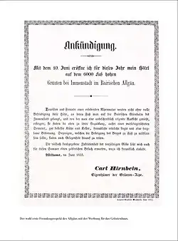 Auf einer Reise in die Schweiz wurde Carl Hirnbein, ein Unternehmer aus Wilhams im Allgäu, auf die Möglichkeiten touristischer Nutzung der Bergwelt aufmerksam. Er berichtete am 30. Juli 1842 seiner Frau von einem Besuch auf der Rigi, wo schon zu dieser Zeit sechs Gasthäuser oder Hotels existierten, und dem Menschenandrang auf dem Berggipfel und kaufte zehn Jahre später sowohl die Alpe Gund in der Grüntenmulde als auch die Alpfläche Schartenschwand. 1853 wurde mit dem Bau eines Gasthauses im „Gebirgsstyle“ nach den Plänen eines Kemptener Architekten auf der Alpfläche oberhalb Burgbergs begonnen.