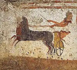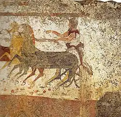 Einen weiteren Unterschied gegenüber ansonsten vergleichbaren Grabmalereien aus paestaner Gräbern stellt der weitgehende Verzicht auf die Darstellung der Figuren durch Umrisslinien ohne Füllfarbe dar: Diese Technik wurde zwar bei der Darstellung der hellhäutigen Nereide auf der Giebelplatte und ihrem Reittier angewandt; die Männerfiguren sind jedoch alle in Hautfarben ausgeführt. Auch die Pferde des Wagenrennens sind eingefärbt; die Quadriga wird von zwei Rappen als Beipferden und dem Fuchs und einem Falben als Stangenpferden gezogen. Nur die Hufe und Teile der Gesichter sind durch Umrisslinien dargestellt und in der Farbe des Maluntergrundes gehalten.