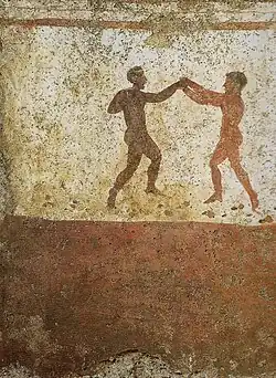 Dies wiederholt sich auch auf der anderen Längsplatte, die, ohne gliedernde Elemente wie Säulen oder Pflanzen, links die häufig anzutreffende Boxkampfszene zwischen zwei nackten Männern zeigt, von denen einer dunkelhäutig ist. Anders als bei zahlreichen anderen Grabmalereien aus Paestum werden sie nicht von einem Flötenspieler angefeuert oder begleitet. Auf der rechten Seite der Platte kämpfen zwei nackte, aber mit Helmen und Schilden geschützte Männer gegeneinander; der Schiedsrichter, der von rechts her die Szene beobachtet, hält einen Kranz in der einen Hand und erhebt die andere.