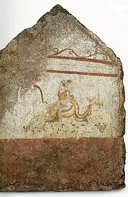 Namengebend für das Grab ist die Darstellung einer Nereide auf einer der Giebelplatten. Bis zur Vorbereitung der Ausstellung der Grabkammer in Deutschland im Jahr 2007 ging man davon aus, dass diese Platte sich auf der westlichen Seite des Grabes befand, mittlerweile wird sie dem östlichen Ende des Grabes zugeordnet. Im Giebelfeld ist noch ein rankenartiges Ornament zu erkennen; das Gemälde im rechteckigen Bildfeld zeigt eine weibliche, mit einem langen, gelblichen Gewand bekleidete Figur, die im Damensitz auf einem Meereswesen reitet. Dieser Hippokamp hat wie sein Pendant vom Grab der Klagefrauen den Vorderleib eines gezäumten Pferdes und einen geschwungenen Fischschwanz. Von dem roten Querbalken, der das Bildfeld nach oben abschließt, hängt rechts über diesem Fischschwanz eine Tänie herab. Den Untergrund bilden rote und schwarze Pinseltupfer. Fast die Hälfte des rechteckigen Plattenteils wird jedoch durch das rotbraune Feld eingenommen, mit dem der untere Teil der Platten ausgefüllt ist. Die Reiterin weist mit dem Zeigefinger der rechten Hand nach unten. Den linken Arm hat sie auf den Rand eines Schildes gestützt. Andreae deutet die Szene wie folgt: „Da es sich um ein Männergrab handelt, kann diese Nereide nicht etwa selbst die Verstorbene sein, sondern sie geleitet den verstorbenen Ritter, dessen Schild [...] sie trägt, übers Meer zu den Inseln der Seligen. Mit dem ausgestreckten rechten Zeigefinger scheint sie den Weg zu weisen“.[2]