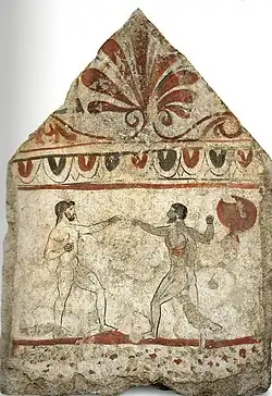 Die beiden Platten von den Schmalseiten des Grabes sind fünfeckig; ihr Giebelfeld ist jeweils durch eine Palmette ausgefüllt und durch einen von Linien eingefassten Eierstab von der rechteckigen Bildzone abgetrennt. Eine der Platten ist gut erhalten; sie zeigt einen Boxkampf zwischen einem hell- und einem dunkelhäutigen nackten Mann. Bis auf die bandagierten Fäuste sind die beiden Kämpfenden nackt. Dem linken, hellhäutigen Boxkämpfer fließt bereits das Blut aus der Nase, und auf dem Rücken seines Gegners ist ein blutiger Abdruck einer rechten Hand zu sehen. Diese Hand ist allerdings geöffnet, der Abdruck kann also kaum von einem der beiden Boxer stammen. Rechts von dieser Szene, neben der erhobenen Faust des dunkelhäutigen Kämpfers, schwebt ein überdimensionaler Granatapfel. Die beiden Boxer stehen auf einer breiten, roten Bodenlinie, unterhalb derer durch verschiedenfarbige Pinseltupfer die Struktur des Bodens angedeutet zu sein scheint. Unklar ist, welche Intention der Maler bei der Gestaltung des rechten Beins des Dunkelhäutigen hatte. Eine offenbar etwas beschädigte Stelle der Malerei scheint darauf hinzuweisen, dass es in einer Version des Bildes in einer Art Ausfallschritt mit gebeugtem Knie rechts nach hinten gestreckt war und damit oberhalb der roten Bodenlinie endete. Die Umrisszeichnung eines Fußes, der aber eher senkrecht nach unten – über die Bodenlinie, die dafür unterbrochen wurde! – hängt, scheint sich aber nach oben fortzusetzen und in der Hüfte des Kämpfers zu enden. Dieses Bein passt jedoch weder von der Länge noch von seiner Haltung her zur Position des Faustkämpfers, darüber hinaus ist es nicht so deutlich koloriert wie der Rest des Körpers.