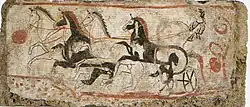 Benannt ist das Grab nach der Darstellung auf der erhalten gebliebenen Längsplatte. Sie zeigt unter einer roten Begrenzungslinie und zwischen zwei weiteren großen Granatäpfeln (einer davon wächst aus einer roten Ranke) eine nach links fahrende Quadriga, hinsichtlich derer es ungewiss ist, ob sie in einem Rennen fährt oder allein präsentiert wird. Im Gegensatz zu Darstellungen auf älteren Grabmalereien aus Paestum, etwa dem Grab der Hirschjagd oder dem Grab der Granatäpfel, zeigt der mit einem längs gestreiften kurzen Obergewand bekleidete Wagenlenker hier eine dynamischere Körperhaltung; er beugt sich zurück und scheint mit den Beinen die Bewegung des Wagens auf dem holprigen Untergrund auszugleichen. In den Händen hält er zwei Zügelstränge, mit denen er das Gespann dirigiert, aber keine Peitsche. Der Wagen ist, anders als bei den älteren Gräbern, schräg von vorn dargestellt, man sieht die Achse zwischen den beiden vierspeichigen Rädern, die aus perspektivischen Gründen oval gezeichnet wurden. Dagegen galoppieren die vier Pferde – zwei Schimmel mit dunklen Mähnen und zwei Rappschecken mit erstaunlicherweise braunen Mähnen und Schweifen – nicht auf den Betrachter zu, sondern von rechts nach links.