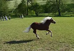 Die Pferde sind gegeneinander versetzt angeordnet, so dass von jedem das vordere Drittel unverdeckt dargestellt werden konnte, und zeigen eine bis hin zur Stellung der Ohren und zur Richtung des Blicks einheitliche Körperhaltung: Der rechte Vorderhuf ist im Galoppsprung sehr hoch erobern, der linke greift weiter unten aus, auch der rechte Hinterhuf ist in dieser Phase des Bewegungsablaufes nach vorn erhoben und nur der linke Hinterhuf berührt gerade den Boden oder sollte ihn doch berühren, denn hier scheint wieder ein Unglück bei der Bildkomposition geschehen zu sein: Das hinterste Pferd ist anatomisch ziemlich korrekt wiedergegeben, schwebt aber eben deshalb in der Luft, da offenbar die Bodenlinie, die mit Rücksicht auf die Wagenräder Aussparungen aufweist, zu früh oder zu spät gezogen wurde und auf die Position dieses Schecken dabei keine Rücksicht genommen werden konnte. Die nur andeutungsweise skizzierten Hinterbeine der drei anderen Pferde sitzen zum Teil an anatomisch unmöglichen Stellen, ihre Hufe stolpern durch regelrechte „Löcher“ im Untergrund, die offenkundig dadurch entstanden sind, dass die rote Bodenlinie links auf einer Höhe begonnen wurde, die zu den Vorderbeinen des ersten Pferdes noch gepasst hätte, in der Mitte aber eben wegen dieser skizzierten Hinterbeine nicht durchgehalten werden konnte und nach unten korrigiert werden musste, um schließlich rechts unter bzw. hinter dem Wagen viel tiefer zu enden als am anderen Bildende.