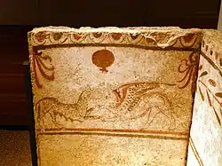 Nur drei der vier Kalksteinplatten, die die Grabkammer bildeten, konnten bei Ausgrabungen geborgen werden. Ihre Ausmaße – 84 × 77 cm an den Schmalseiten und 81 × 132 cm an der Langseite des Grabes – lassen darauf schließen, dass darin ein Kind bestattet war. Über die ursprüngliche Anordnung der Platten wurde man sich erst im Zuge der Vorbereitung einer Ausstellung in Deutschland im Jahr 2007 klar, als die Grabkammer wieder in Sarkophagform zusammengesetzt wurde. In Paestum werden die bemalten Platten aus der Nekropole nur einzeln gezeigt, weil ihr hohes Gewicht eine andere Präsentationsform nicht erlaubt. Nach aktuellem Stand der Forschung befand sich die namengebende Platte, auf der ein Tierkampf dargestellt ist, auf der Schmalseite am östlichen Ende des Grabes, wo der Kopf des Toten ruhte. Ein Pantherweibchen mit rotgefärbtem Gesäuge kämpft hier gegen einen Löwengreif. Bräunlich lavierte Streifen begleiten einen Teil der Umrisslinien des Greifen und heben die Muskulatur an dessen linkem Hinterbein hervor.[2] Auch die Fellfärbung der Raubkatze sowie ein Teil der Federn der Greifenflügel sind durch lavierte Malerei anschaulich gemacht. Über den beiden Tieren ist ein Granatapfel als Symbol der Fruchtbarkeit dargestellt.