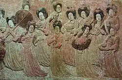 Auf zwei bemalten Marmorreliefs ist eine Gruppe von Dienerinnen sowie ein fünfzehnköpfiges Damenorchester zu sehen.[1][2] Es gibt Aufschlüsse über den Musikgeschmack der Oberschicht der ausgehenden Tang-Dynastie.