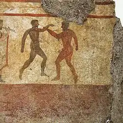 Ähnliches lässt sich bei den Darstellungen der Leichenspielszenen auf den Seitenplatten des Grabes beobachten: Die eine zeigte, wie viele Längsplatten aus Männergräbern dieser Zeit und Gegend, ein Arrangement aus zwei Kampfszenen; bewaffnete Krieger und nackte Boxer maßen sich jeweils im Zweikampf. Jedoch ist die Anordnung der beiden Szenen im Vergleich etwa zum Grab der Nereide, dem Grab der Hirschjagd oder dem Grab der Granatäpfel umgekehrt; die Waffenkämpfer befanden sich im linken Bildteil. Dieser ist allerdings schwer beschädigt. Besser als die Waffenkämpfer sind die beiden Boxer in der rechten Bildhälfte zu erkennen, von denen der linke eine dunkel-, der rechte eine rötlichbraune Hautfarbe aufweist. Links von ihnen und ihnen zugewandt steht ein Aulosspieler. Er benutzt eine Phorbeia und trägt weiße, mit roten Zickzacklinien und Borten geschmückte Kleidung und schwarze Stiefel. Seine unbekleideten Körperteile sind mit dunklen Umrisslinien gezeichnet und in heller Hautfarbe koloriert, das dunkle Haar durch Binnenzeichnung veranschaulicht.