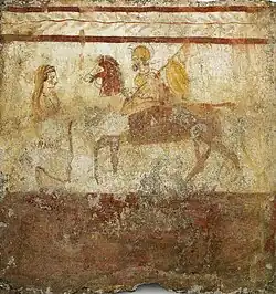 Auf der gegenüberliegenden Schmalseite und damit vermutlich am Kopfende des Grabes war die Heimkehr des siegreichen Ritters zu sehen, ein Motiv, das in der lukanischen Grabmalerei häufig auftritt. Die Platte ist etwas beschädigt. Zu erkennen ist noch der auf einem schwungvoll ausschreitenden Fuchs mit gestutzter Mähne reitende Mann in Panzer und Helm mit den Trophäen, die an seiner Lanze befestigt sind. Die gelbe Farbe dieser Elemente deutet den Glanz des Metalls an. Empfangen wird er von einer geschminkten Frau mit einem gefältelten, rotgeränderten Schleier auf dem Hinterkopf und einem Gewand, das mit einer roten Zickzacklinie geschmückt ist. Arme und Hände dieser Gestalt sind nicht mehr zu erkennen; es ist jedoch davon auszugehen, dass sie ihm den in dieser Szene zu erwartenden Willkommenstrunk präsentiert hat. Die Gesichter und die noch erkennbaren Gliedmaßen sind mit Umrisslinien gezeichnet, doch während die Hautfarbe der Frau dem weißlichgrauen Maluntergrund entspricht, ist die Haut des Ritters leicht getönt.