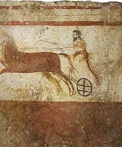 Auf der anderen Längsplatte ist das obligatorische Wagenrennen dargestellt: Zwei Bigae folgen einander, optisch getrennt durch eine mit einer Binde geschmückte Säule und eine vom oberen Bildrand herabhängende Girlande. Die Fahrer haben jeweils links einen Fuchs und rechts einen Falben eingespannt; das hellere Pferd ist jeweils nur durch Konturen, die fast wie ein Schatten seines Gespannpartners wirken, angedeutet. Die Wagenlenker tragen lange weiße, rot geschmückte Gewänder und haben jeweils ein Knie gebeugt. Sie blicken beide nach vorn, führen die Zügel mit der linken Hand und handhaben die Peitsche mit der rechten. Variationen bietet außer der Haar- und Bartfarbe der beiden Rennfahrer lediglich die Gestaltung der Räder der beiden Wagen. Während der vordere vier radiale Speichen aufweist, ist das Rad des hinteren Wagens anders konstruiert.