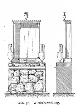 Die Grabbezirke der Eckterrasse wurden 338 v. Chr. zerstört. Nur zwei Grabbezirke des Bereiches wurden danach wieder erneuert, einer davon war der Grabbezirk für Makareus. Er wurde durch eine Polygonalmauer begrenzt. Darauf wurde zur Gräberstraße hin ein Naïskos[1] auf einer Basis aus Piräuskalkstein errichtet. Da noch ein großes Grabmal errichtet wurde, muss es noch vor dem Erlass des Grabluxusgesetzes während der Regentschaft des Demetrios von Phaleron (zwischen 317 und 307 v. Chr.) errichtet worden sein. Eine Inschrift wurde auf dem marmornen Giebel angebracht, die Makareus aus dem Demos Lakiadai und Archebios als Grabinhaber nennt. Ein Grabepigramm auf der Basis, das heute nur noch schlecht erhalten ist, berichtet vom begabten Tragödienschauspieler Makareus, der schon in jungem Alter verstorben war.[2] Im Naïskos befand sich kein Relief, somit ist davon auszugehen, dass der Schmuck aufgemalt war. Seitlich wurde der Grabbau von zwei marmornen Grablekythen flankiert.