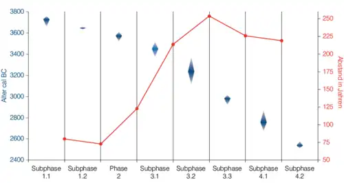Aufgrund der Schichtenabfolgen kann eine relative Chronologie erstellt werden und diese wurde mittels der sog. 14C-Methode absolutdatiert. Auf dieser Grundlage wurde ein Phasenmodell erstellt.