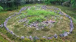 An den Steinkranz, der zu drei Vierteln von einem offenen Graben umgeben war, schließt sich im Osten ein nahezu rechteckiger Vorplatz von etwa 650 m² an, innerhalb dessen sich, nahe dem Steinkranz, kleine hakenförmige und bogenförmige Steinsetzungen befinden, die beiden so genannten „Kultnischen“. Eine rechteckige Verfärbung, vielleicht die Reste eines Holzbaues, liegt auf dem Vorplatz, der mit dem Kult in Zusammenhang zu stehen scheint, worauf sich auch bei Grabhügeln der Umgebung (Gräberfeld in der Addenstorfer Heide) Hinweise fanden.