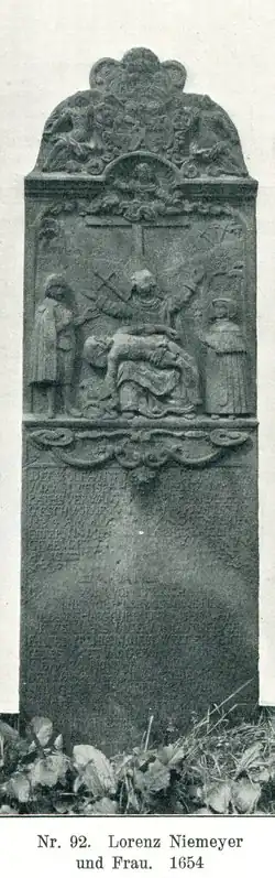 - ↑ a b c d e Carl Schuchhardt: Nr. 92. Schmales Standmal des Lorenz Niemeyer und seiner Frau Dorothea Mehlbaum, 1654, in ders.: Die hannoverschen Bildhauer der Renaissance, Hahnsche Buchhandlung, Hannover 1909, S. 129–130; Digitalisat über archive.org