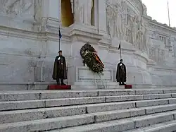Das Grabmal des unbekannten Soldaten befindet sich im Monumento Vittorio Emanuele II (Vittoriano) in Rom. General Giulio Douhet schlug am 24. August 1920 den Bau des Grabmals im Pantheon vor, das Parlament beschloss dann am 4. August 1921 einstimmig den Vittoriano als Standort. Eine Kommission wählte elf unbekannte italienische Gefallene des Ersten Weltkriegs aus, von denen Maria Bergamas aus Triest, Mutter eines gefallenen Kriegsfreiwilligen, in der Basilika von Aquileia am 28. Oktober 1921 einen für das Grabmal bestimmen sollte. Da sie vor dem zehnten Sarg zusammenbrach, wurde dieser genommen und vom 29. Oktober bis zum 2. November 1921 per Bahn in langsamen Tempo unter großer öffentlicher Anteilnahme nach Rom gebracht und am 4. November im Vittoriano beigesetzt. Das Grabmal befindet sich unter dem Reiterstandbild König Viktor Emanuels II.; auf der Außenseite ist stets eine Ehrenwache, im Inneren des Monuments ist das Grabmal Teil einer Krypta. An der Außenseite des Grabmals erfolgen an bedeutenden Feiertagen und bei Staatszeremonien Kranzniederlegungen.[4]