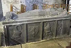 Das Grabmal von Jean de Kerouzéré ist aus Kersantit gemeißelt. Es wurde noch im Jahr 1460, dem Jahr seines Todes, geschaffen. Das Grabmal besteht aus einem Sarkophag und einem Deckel mit der Liegefigur des Toten. Jean de Kerouzéré ist mit einer Tunika bekleidet, auf der ein Löwe dargestellt ist. Auf dem Gürtel seines Gewandes sieht man eine Inschrift mit seiner Devise „LIST, LIST“ (lasst es sein). Zwischen seinen Beinen liegt ein Schwert, ein weiteres Schwert liegt an seiner linken Seite. Das Haupt des Toten ist auf ein Kissen gebettet, seitlich sitzen zwei Engel, die in zärtlicher Geste ihre Hände an sein Haupt legen. Zu seinen Füßen kauert ein Löwe, der in seinen Pranken einen Knochen hält. Die Seitenwände des Sarkophags sind mit Wappenschilden, auf denen Löwen und Schwäne dargestellt sind, verziert.