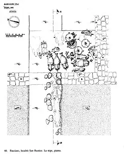 d Ereignis des Einsturzes des Gebäudes (negative strati­graphi­sche Einheiten des Ein­sturzes der Wände, hervor­gehoben durch die dunklen Linien, und positive strati­graphische Ein­heiten des Ein­sturzes der Mate­rialien)